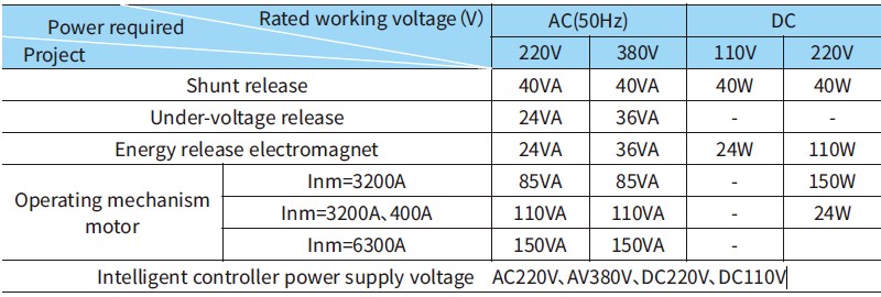 4. Operating voltage and required power of circuit breaker shunt release, under-voltage release, operating mechanism, intelligent controller for energy release electromagnet
