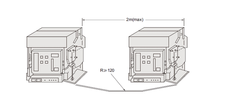 The interlocking mechanism can interlock two or three circuit breakers for multi-channel power supply system. The mechanical interlocking device is installed on the right board of the circuit breaker. When it is installed vertically, the circuit breaker is interlocked with connecting rod; when it is installed horizontally or vertically, the circuit breaker is interlocked with steel cable, and the interlocking device is installed by the user. See Fig. 1 and Fig. 2 for the interlocking schematic diagram.